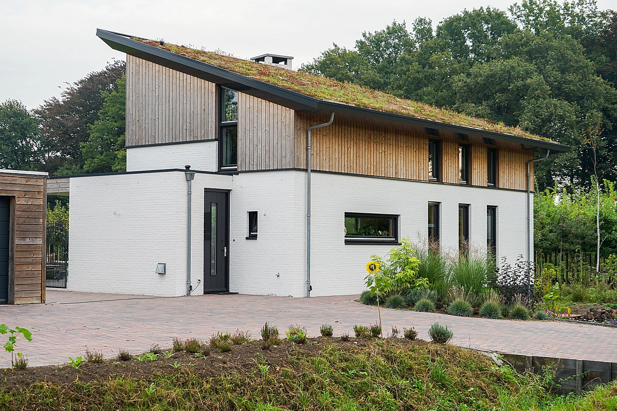 Deze duurzame moderne woning heeft een sedumdak en kent een mooie afwerking met diverse natuurlijke materialen. De wit gekeimde wanden contrasteren mooi met het mooie, blanke Finse rabat én de antraciet gekeimde rand onderaan.